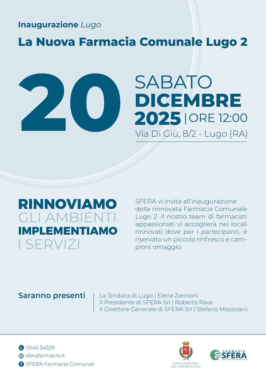 SFERA è lieta di annunciare l’inaugurazione della nuova Farmacia Comunale Lugo 2, che riapre al pubblico dopo un importante intervento di rinnovamento degli ambienti e dei servizi. L’appuntamento è per sabato 20 dicembre, alle ore 12:00, nei locali rinnovati di via Di Giù 8/2 a Lugo (RA).