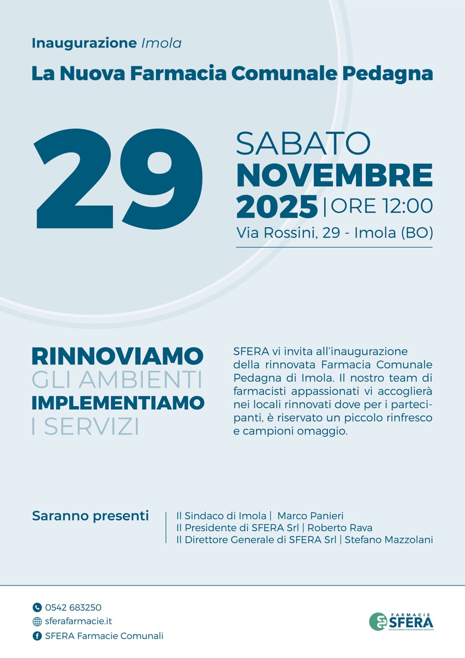 L'evento vedrà la partecipazione del Sindaco di Imola, Marco Panieri, e dei vertici di SFERA: il Presidente Roberto Rava e il Direttore Generale Stefano Mazzolani. Sarà un momento per scoprire la nuova Farmacia, incontrare il nostro team di farmacisti appassionati sempre pronto ad accogliervi e ricevere un piccolo rinfresco con campioni omaggio.